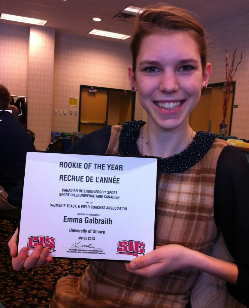 Emma is the first Gee-Gee to ever win a national rookie of the year award in track and field. Hurdler Ashlea Maddex was previously nominated for the same award in 2011. Galbraith is also only the second University of Ottawa student to recognized by the CIS following long jumper Christopher Greenaway’s Field Event MVP award in 2010.